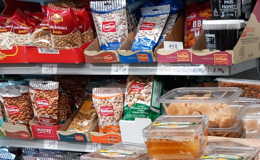 知らない豆類、甘いお菓子類もレジのあたりに山積みにされていた。