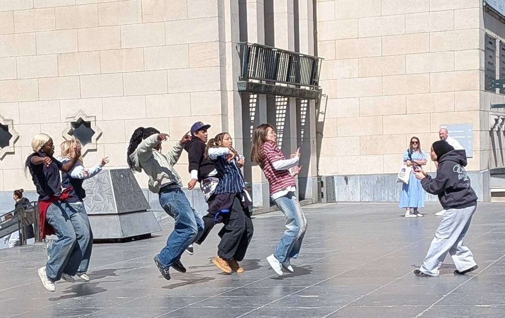 路辺でダンスを踊っている若者たち。