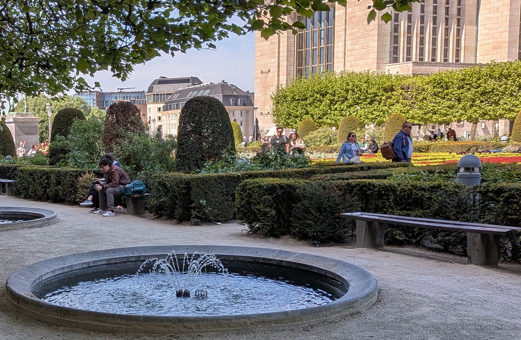 しょぼいけど笑、噴水も5,6個並んでいて、そのベンチでおしゃべりしたり、休憩したりしている人たちも。暑い日には木陰もうれしい。お水の音に癒されれる。