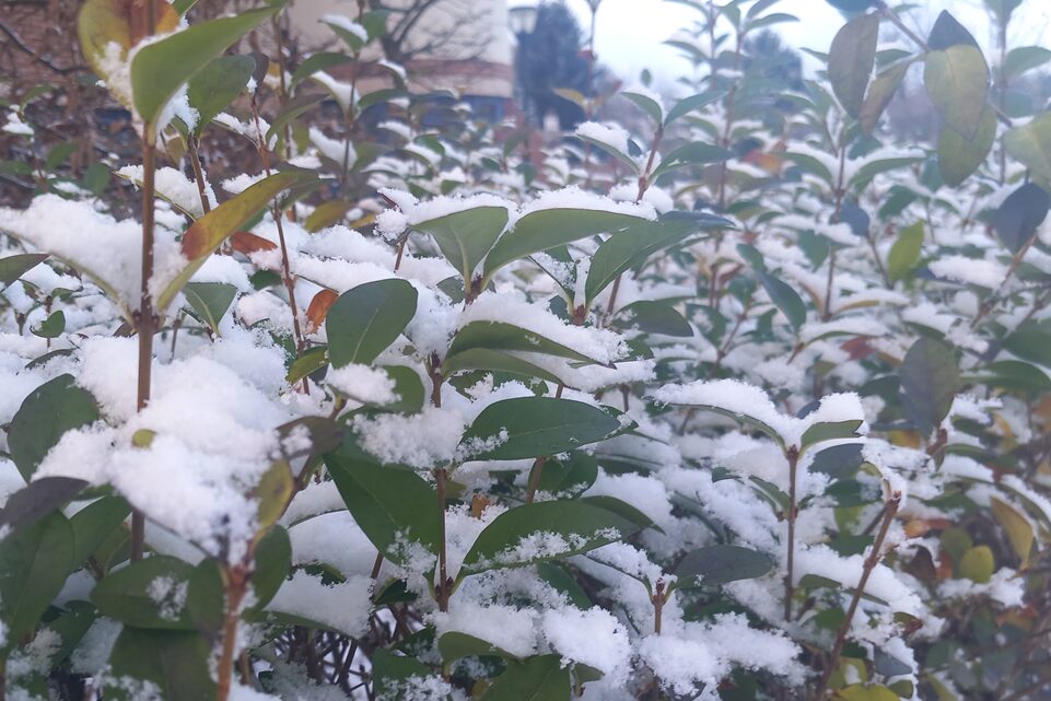 葉っぱたちも雪の重みに耐えて頑張っている。