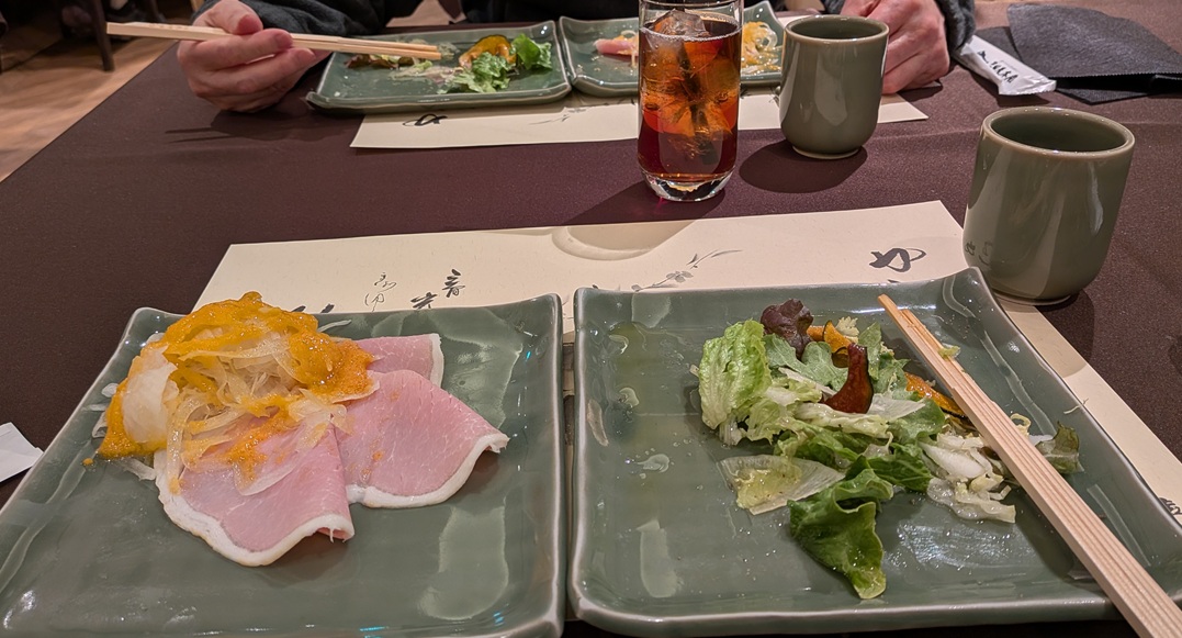 前菜が運ばれ、店員さんが熱いお茶をもってくると