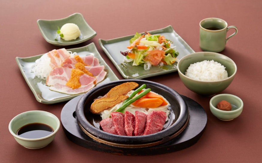 ランチは野菜サラダ、ロースハムと玉ねぎの薄切り、スープ、ごはんがついていて、ステーキが選ぶことができる。それで5,000円以内に収まるというお得なランチセットだ。
