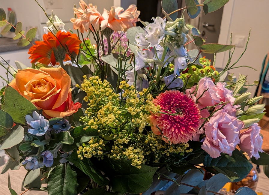 ということで、いつものワインやらパスタや、瓶物が詰まっためちゃ重たいバスケットと両手で抱えないと抱えきれないくらいの大きな花束を頂き、自分の荷物も持ってタクシーに乗り込む。